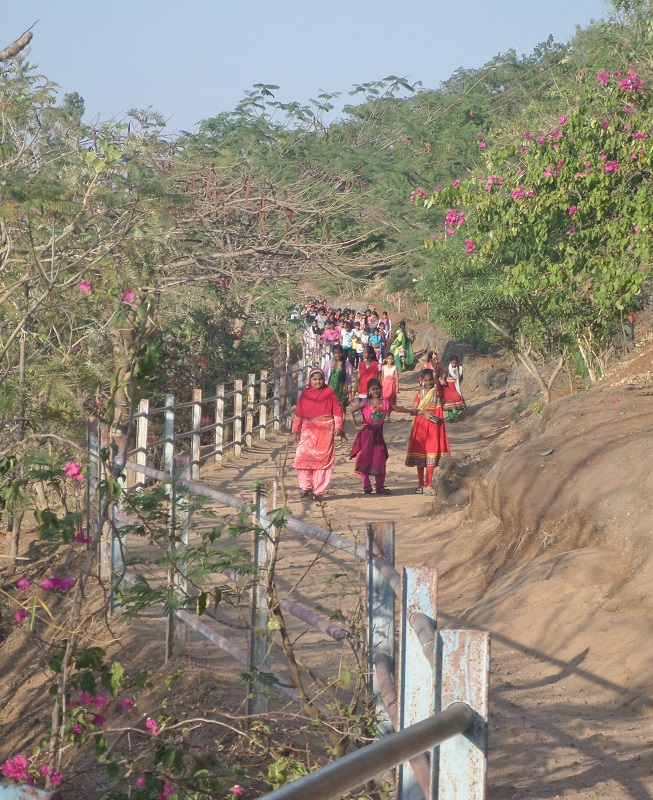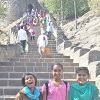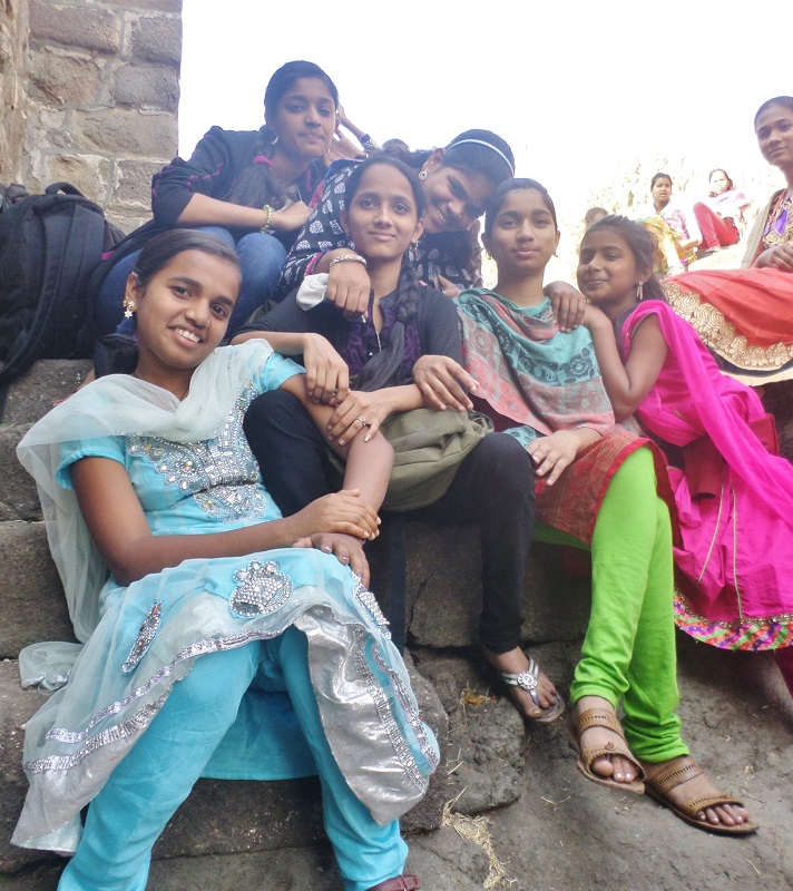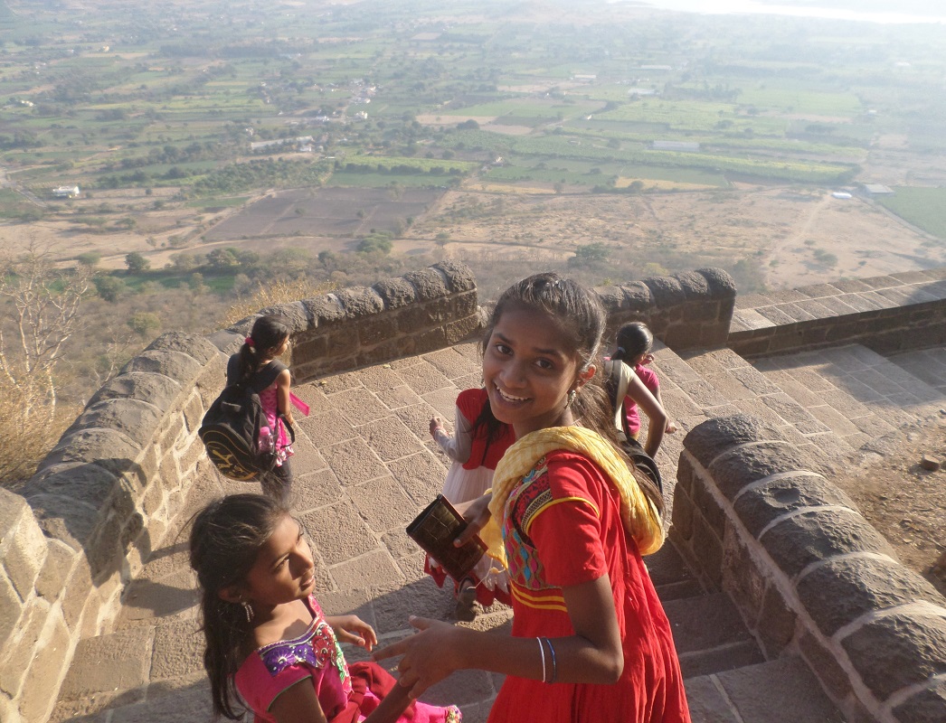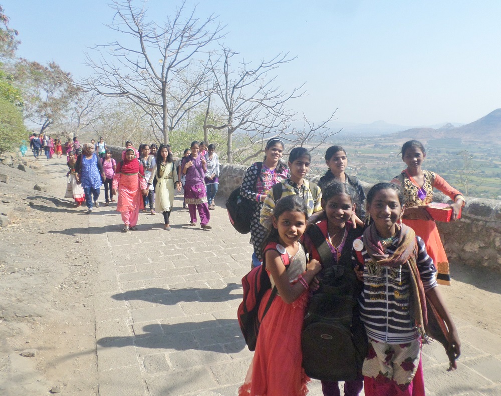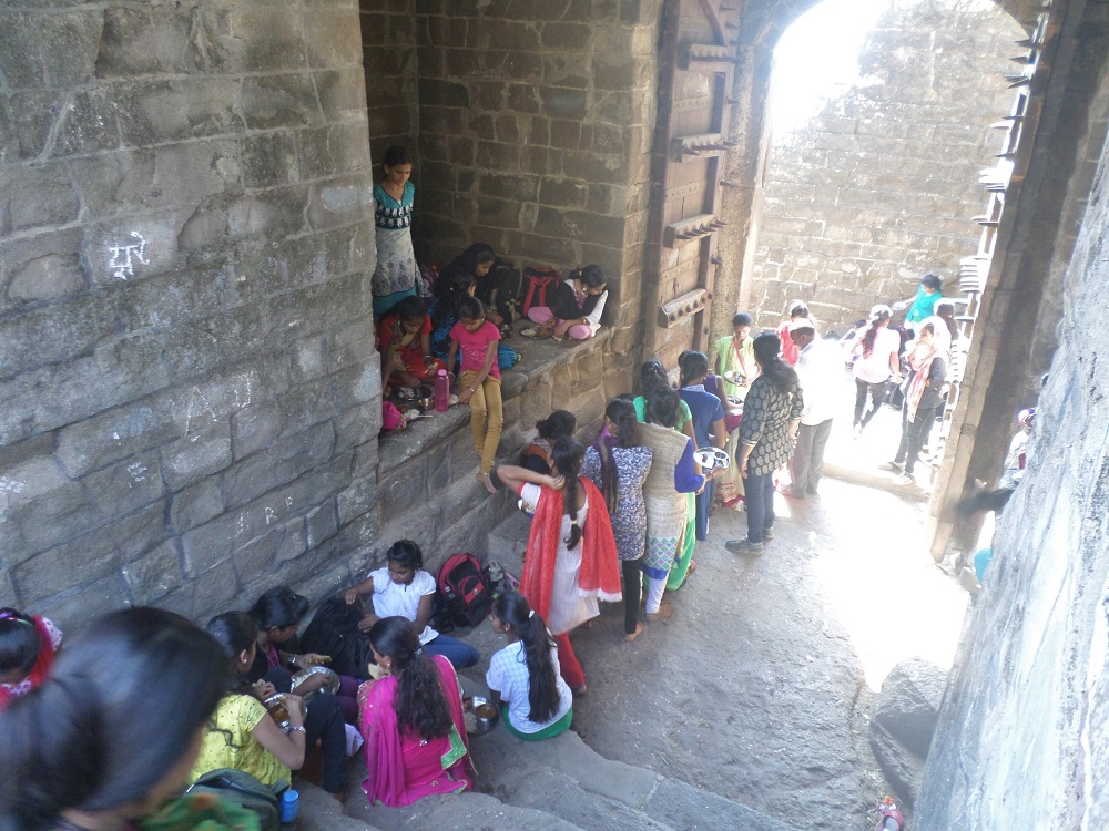 A record seventy-four girls left our Janata Vasahat neighbourhood on two busses at daybreak. Hardly sleepy, we were quickly singing and dancing, pausing only to eat our breakfast. Once out of Pune, to the north we enjoyed increasingly beautiful countryside and rolling hills. Climbing through colourful villages, quaint farms, and thick forests, we finally reached the highlands of Bhimashankar late in the morning. We visited an ancient and famous temple, and bought sweets and souvenirs. Then back on the bus for another scenic two-hour journey to Shivneri Fort. The ancient fort is most famous as the birthplace of Chhatrapati Shivaji Maharaj, important in our history books as founder of the Marathi Empire. But the fort is also remarkably scenic and pleasant, and the many gates on it's ascent are impressive architectural works. One of these we found to be an ideal and memorable place to have our lunch! -sitting in massive coves in the gate structure, protected from the sun and kept cool by the massive stonework. After our lunch we hiked the rest of the way to the top, pausing for a lot of photos (and water!). By the time we returned to our buses it was evening. We stopped mid-way to Pune for snacks, and arrived home at about 10:30pm, -a very long but memorable day! Below is a photo chronology to share our day with you:Acknowledgements