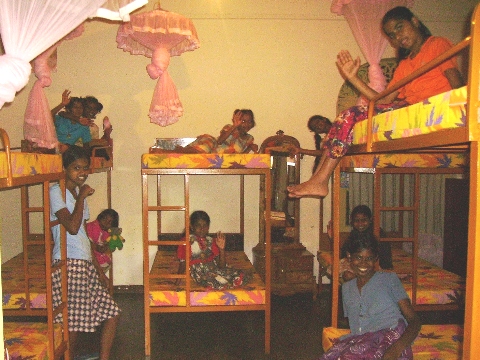 We first provided all new beds and mattresses, -52 beds total. The beds are long enough even for our oldest kids to grow! -and standard-sized, so mattresses can easily be replaced periodically. And since the beds are bunked, a lot of space was created in the rooms. So, in the attractive windowed "bay" end of each room, we put a hardwood table and four chairs, creating a wonderful study and social environment for the kids. We also provided a large mirror and dressing table for each room. Several large storage cabinets were also provided for each room, -large enough for each girl to have plenty of secure space for her own clothes, books, and other belongings. Finally, the single hanging light bulb was replaced in each room by bright new multi-light fixtures.