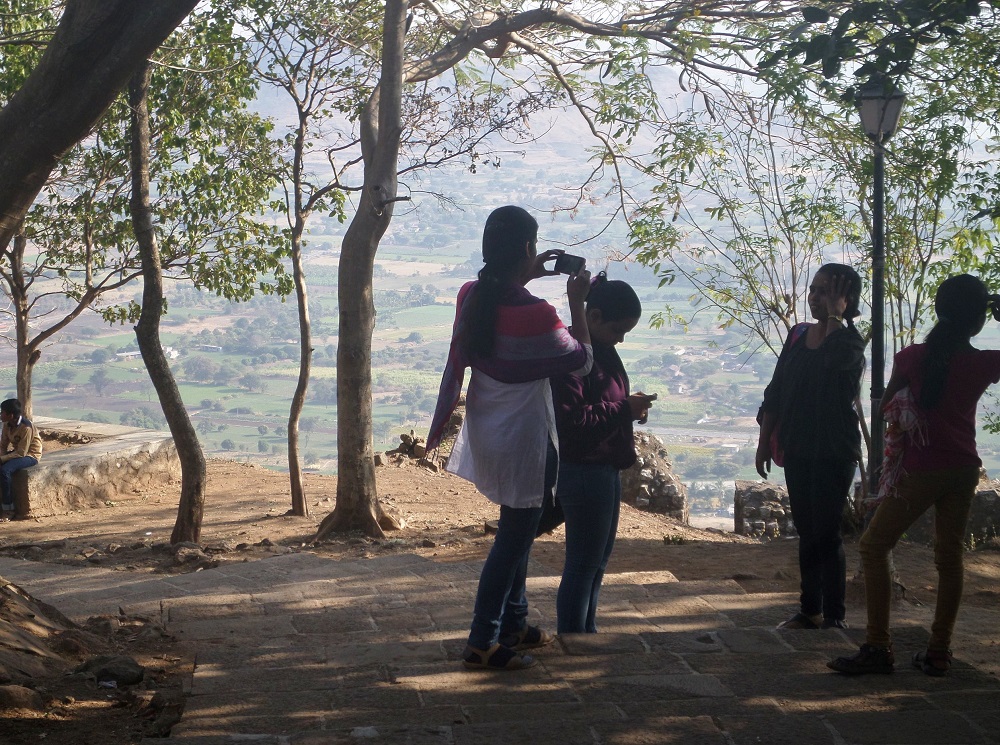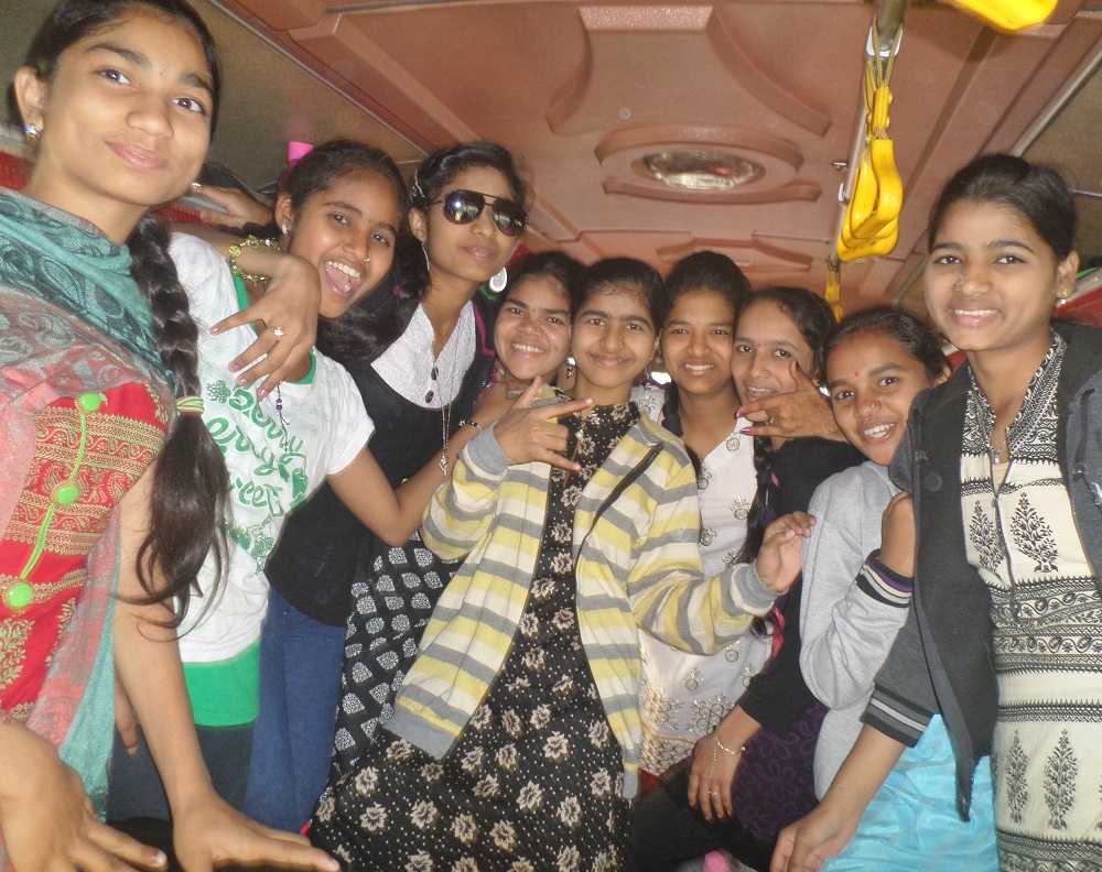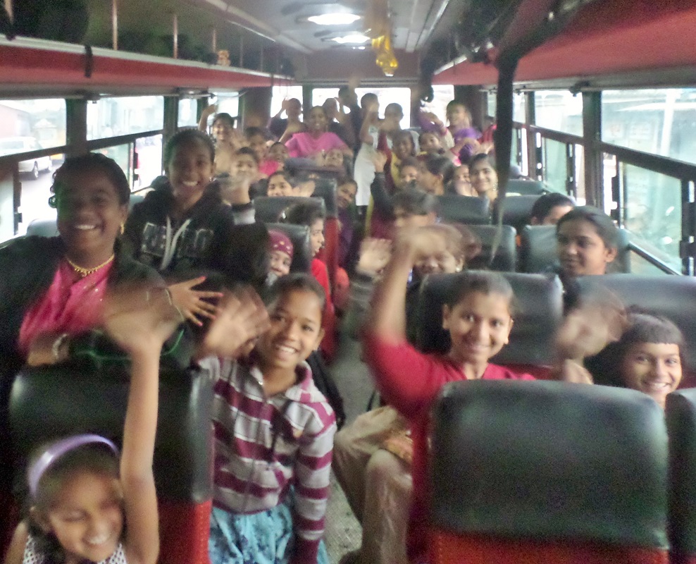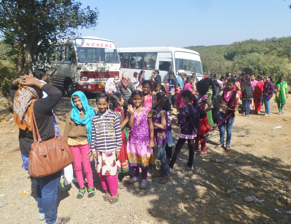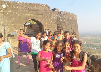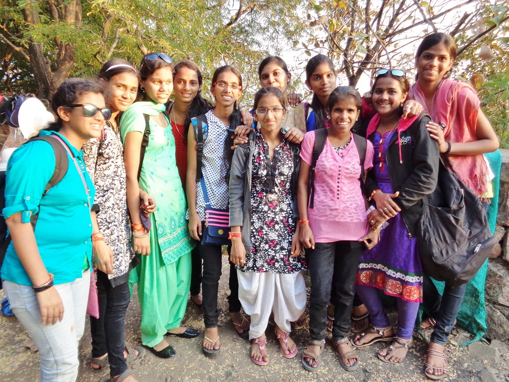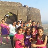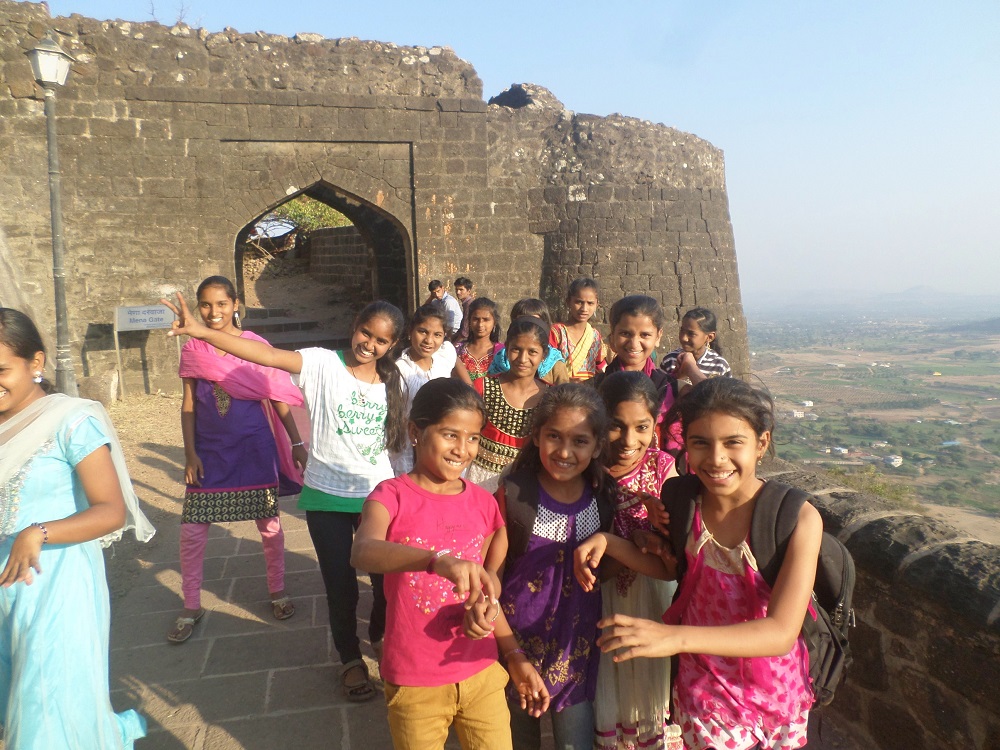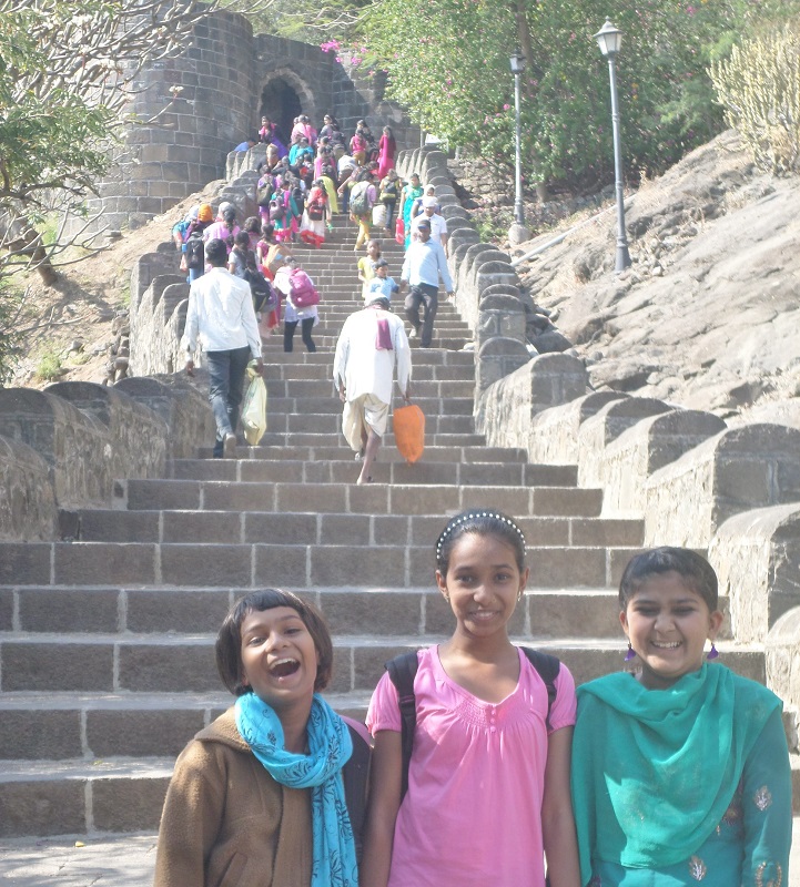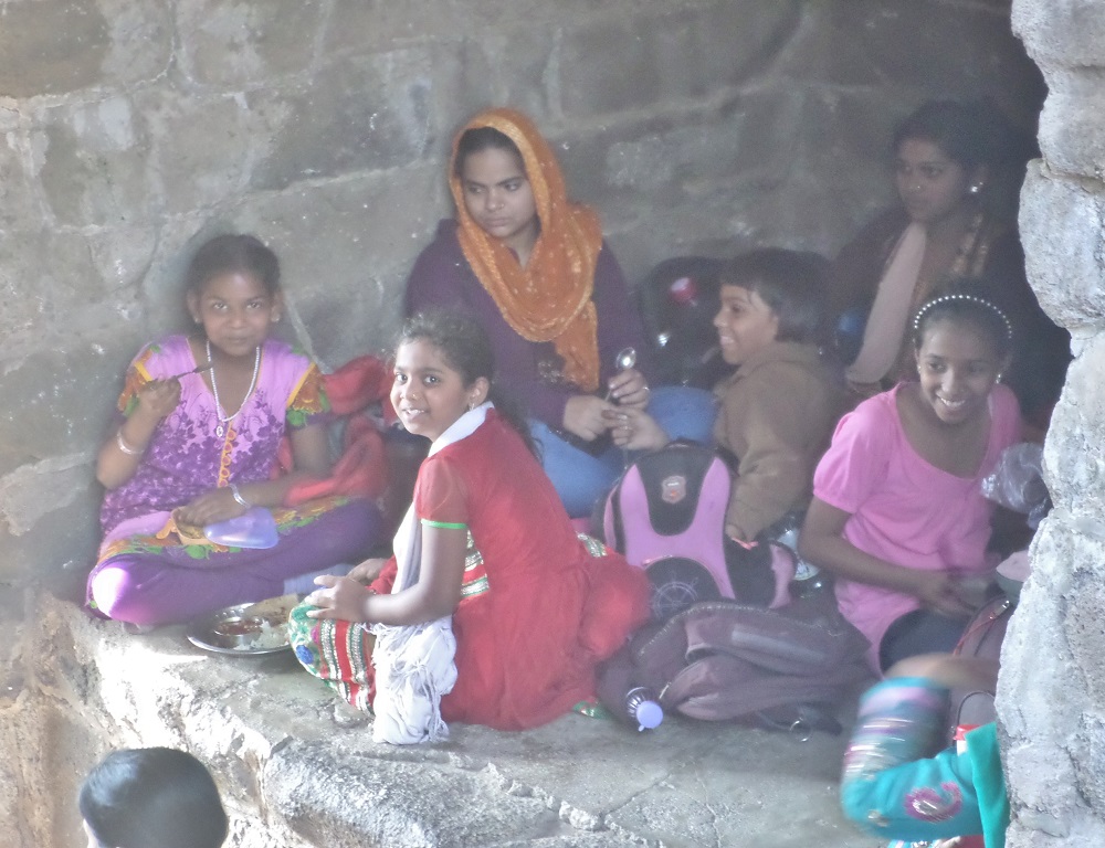 A record seventy-four girls left our Janata Vasahat neighbourhood on two busses at daybreak. Hardly sleepy, we were quickly singing and dancing, pausing only to eat our breakfast. Once out of Pune, to the north we enjoyed increasingly beautiful countryside and rolling hills. Climbing through colourful villages, quaint farms, and thick forests, we finally reached the highlands of Bhimashankar late in the morning. We visited an ancient and famous temple, and bought sweets and souvenirs. Then back on the bus for another scenic two-hour journey to Shivneri Fort. The ancient fort is most famous as the birthplace of Chhatrapati Shivaji Maharaj, important in our history books as founder of the Marathi Empire. But the fort is also remarkably scenic and pleasant, and the many gates on it's ascent are impressive architectural works. One of these we found to be an ideal and memorable place to have our lunch! -sitting in massive coves in the gate structure, protected from the sun and kept cool by the massive stonework. After our lunch we hiked the rest of the way to the top, pausing for a lot of photos (and water!). By the time we returned to our buses it was evening. We stopped mid-way to Pune for snacks, and arrived home at about 10:30pm, -a very long but memorable day! Below is a photo chronology to share our day with you:Acknowledgements