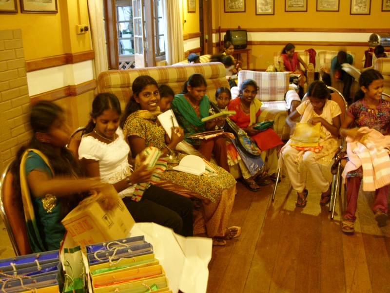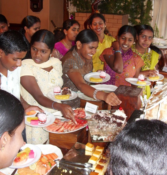We departed Nayabedde by chartered bus at about 2:00 pm for the short ride down to Bandarawela. We were greeted at the door with chocolates, and enjoyed some free time to see our gifts and enjoy the beautiful gardens of the hotel (during a rare break in the monsoon rains!). We each had our photograph taken in the gardens, after which we eagerly filed into the dining hall for our fantastic buffet dinner and all-you-can-eat dessert! -every child's dream...Our Party