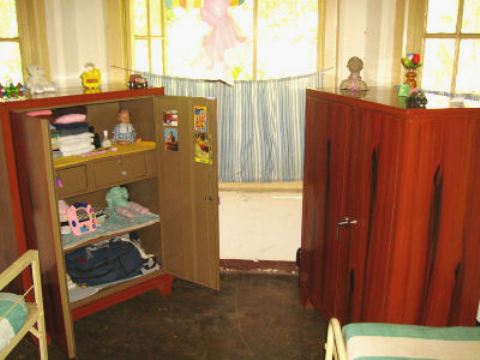 We first provided all new beds and mattresses, -52 beds total. The beds are long enough even for our oldest kids to grow! -and standard-sized, so mattresses can easily be replaced periodically. And since the beds are bunked, a lot of space was created in the rooms. So, in the attractive windowed "bay" end of each room, we put a hardwood table and four chairs, creating a wonderful study and social environment for the kids. We also provided a large mirror and dressing table for each room. Several large storage cabinets were also provided for each room, -large enough for each girl to have plenty of secure space for her own clothes, books, and other belongings. Finally, the single hanging light bulb was replaced in each room by bright new multi-light fixtures.